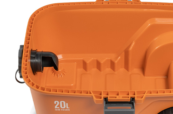 Компактный корпус пылесоса выполнен из современного, ударопрочного пластика с толщиной стенки 3 мм.Стойкий к механическим воздействиям и коррозии.Объем бака 20 литров.