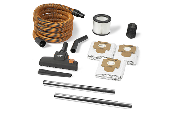 • Щетка для сухой и влажной уборки • Щелевая насадка • Изогнутая насадка • 3 тканевых мешка для сухой уборки • Текстильный мешок для пыли • 2 HEPA фильтра