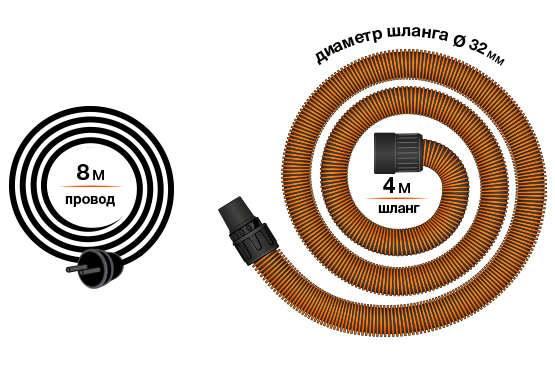 Шланг длиной 4 м позволяет собирать строительный мусор на высоте, без необходимости поднимать пылесос. Антистатическое покрытие позволяет собирать мелкую пыль, не накапливая статический заряд. Удлиненный провод питания до 8 м для удобного использования.
